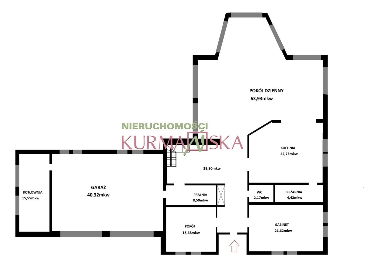 - Na parterze o powierzchni 242,28 m² znajdziesz przestronny korytarz (13,57 m²), gabinet (21,62 m²), pokój gościnny (15,68 m²), WC (2,17 m²), duży hall (29,90 m²), imponujący salon (63,93 m²), kuchnię (22,75 m²) z spiżarnią (4,42 m²), pralnię (8,50 m²), garaż (40,32 m²) oraz kotłownię (15,55 m²).