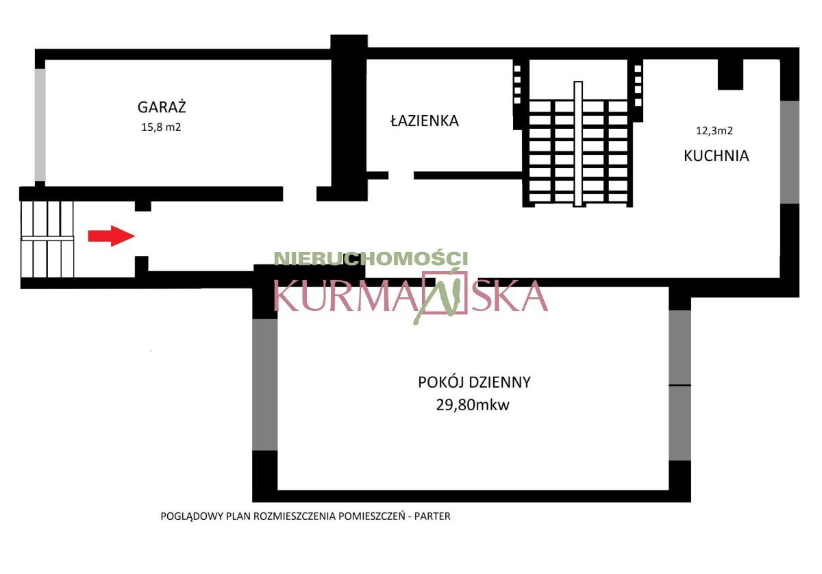 Parter budynku składa się z przestronnego salonu połączonego z jadalnią, oddzielnej dużej kuchni z widokiem na ogród, przedpokoju oraz łazienki.