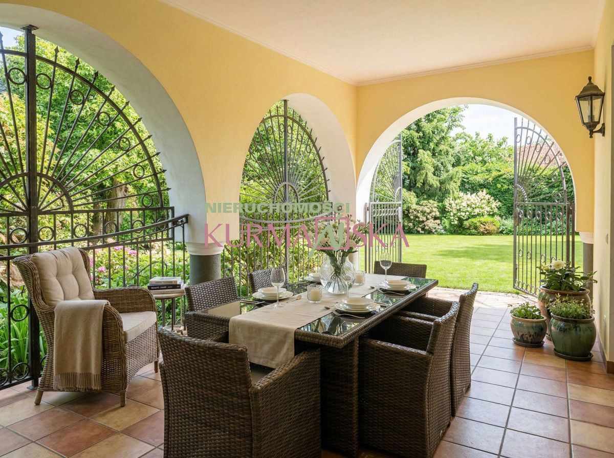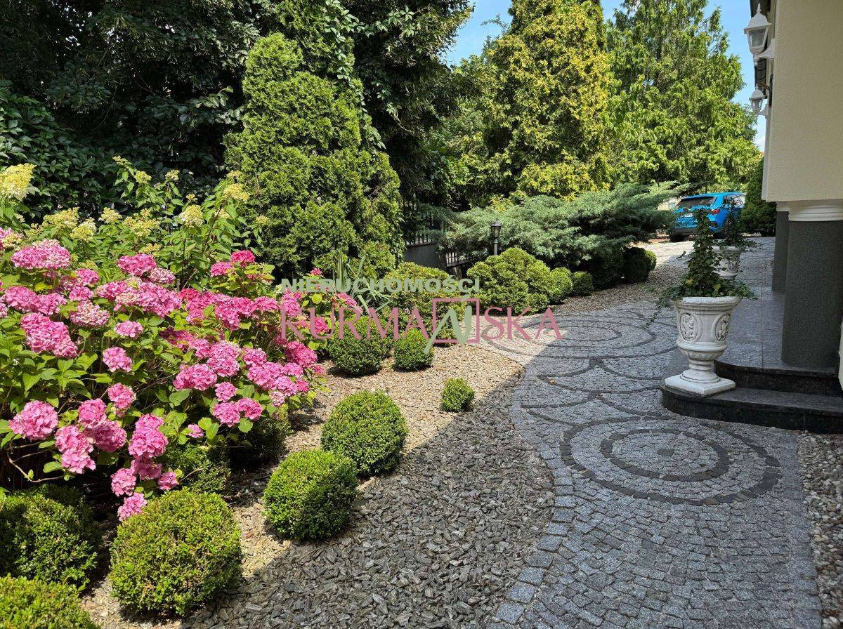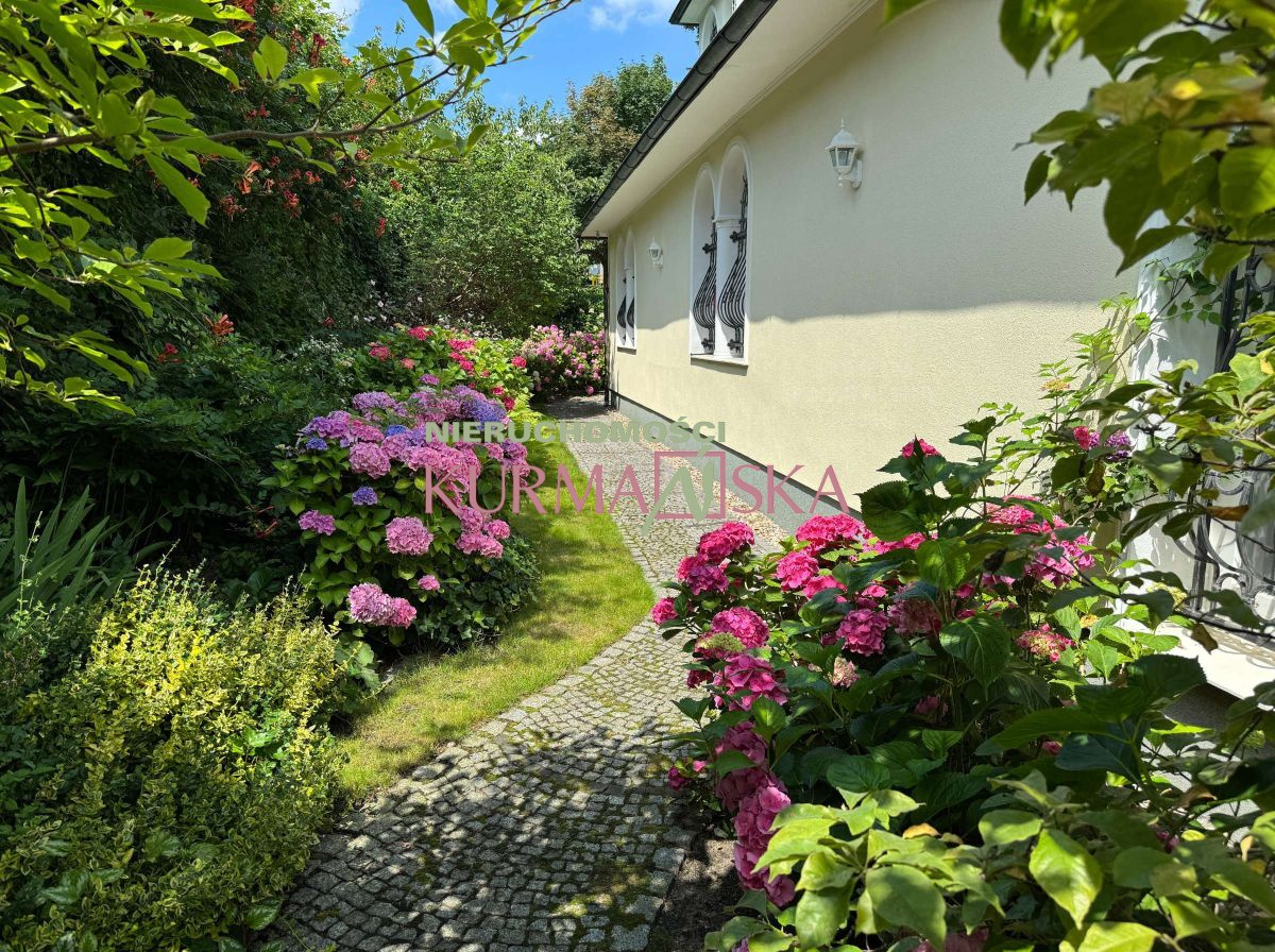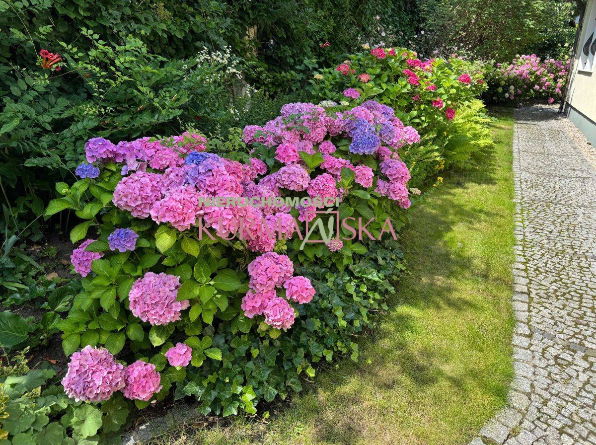 Posiadłość usytuowana jest na w pełni zagospodarowanej, obszernej działce o powierzchni 1 243 m², do której prowadzi reprezentacyjna, kuta brama. Spektakularny ogród z licznymi, dojrzałymi nasadzeniami (w tym zachwycającymi szpalerami hortensji) oraz zadbanym trawnikiem to prawdziwa enklawa spokoju. Pielęgnację ułatwia w pełni zautomatyzowany system nawadniania. To idealne miejsce na poranną kawę na tarasie, przyjęcia na świeżym powietrzu czy relaks z rodziną.