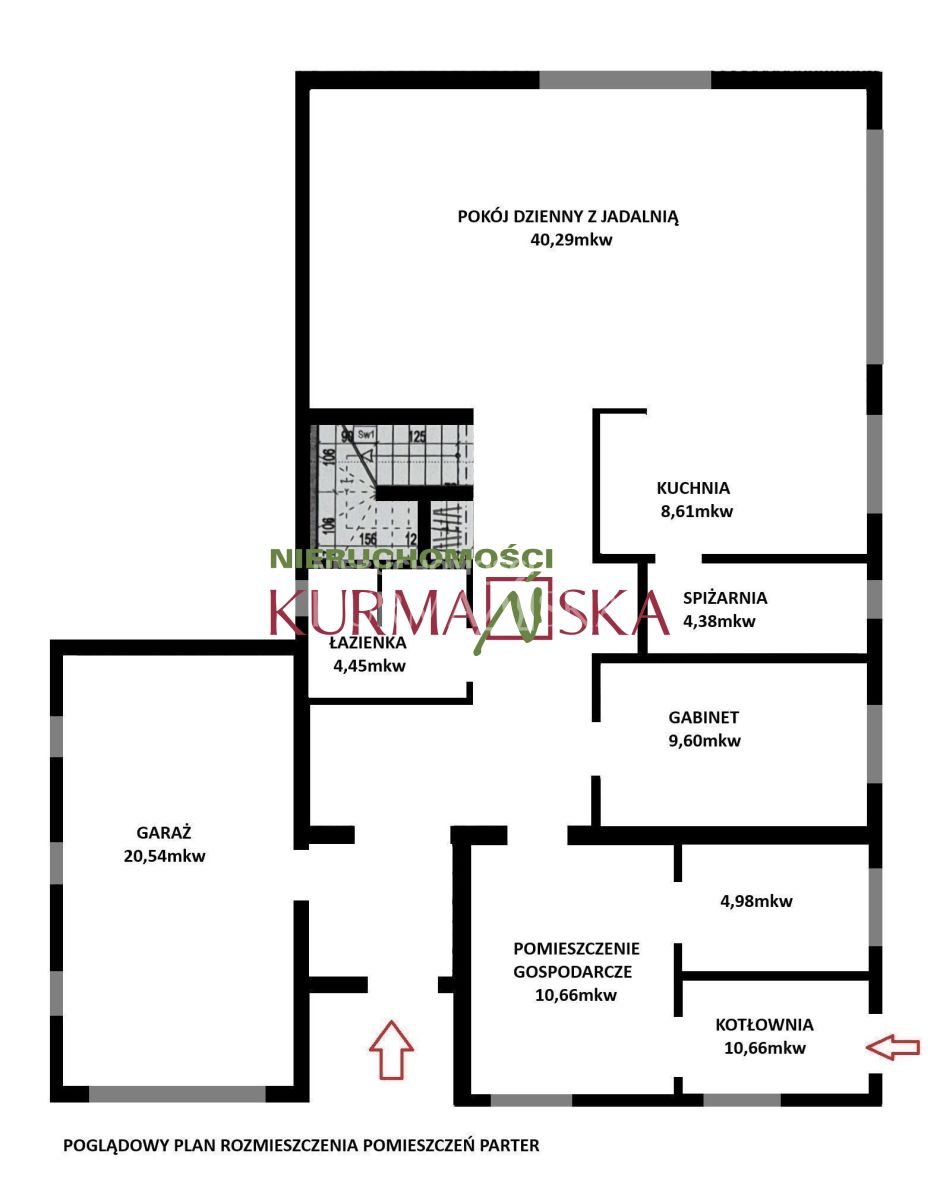 Parter o powierzchni całkowitej 129,56mkw.,składa się z salonu połączonego z jadalnią i kuchnią, spiżarni, pomieszczenia gospodarczego, gabinetu, kotłowni, garażu, łazienki z wc oraz komunikacji.