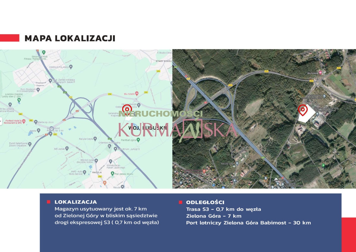- Lokalizacja: 0,7 km od węzła drogi ekspresowej S3, co zapewnia doskonałe połączenie komunikacyjne.