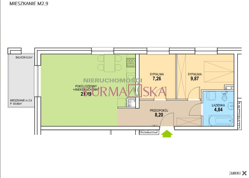 Mieszkanie o powierzchni 59,66 m², składa się z: