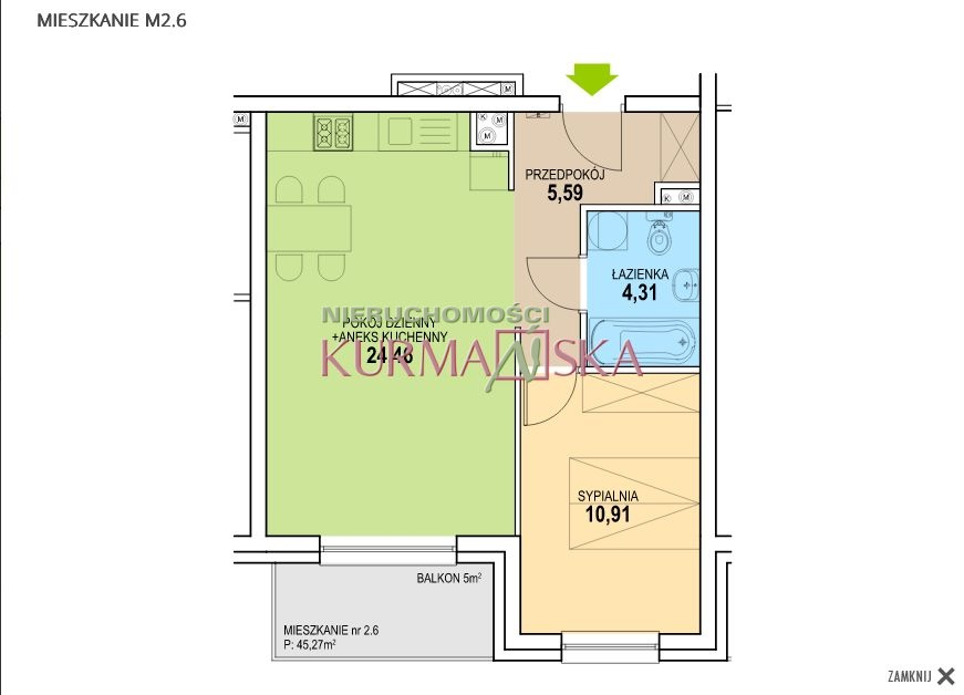 Mieszkanie o powierzchni 45,27 m², składa się z: