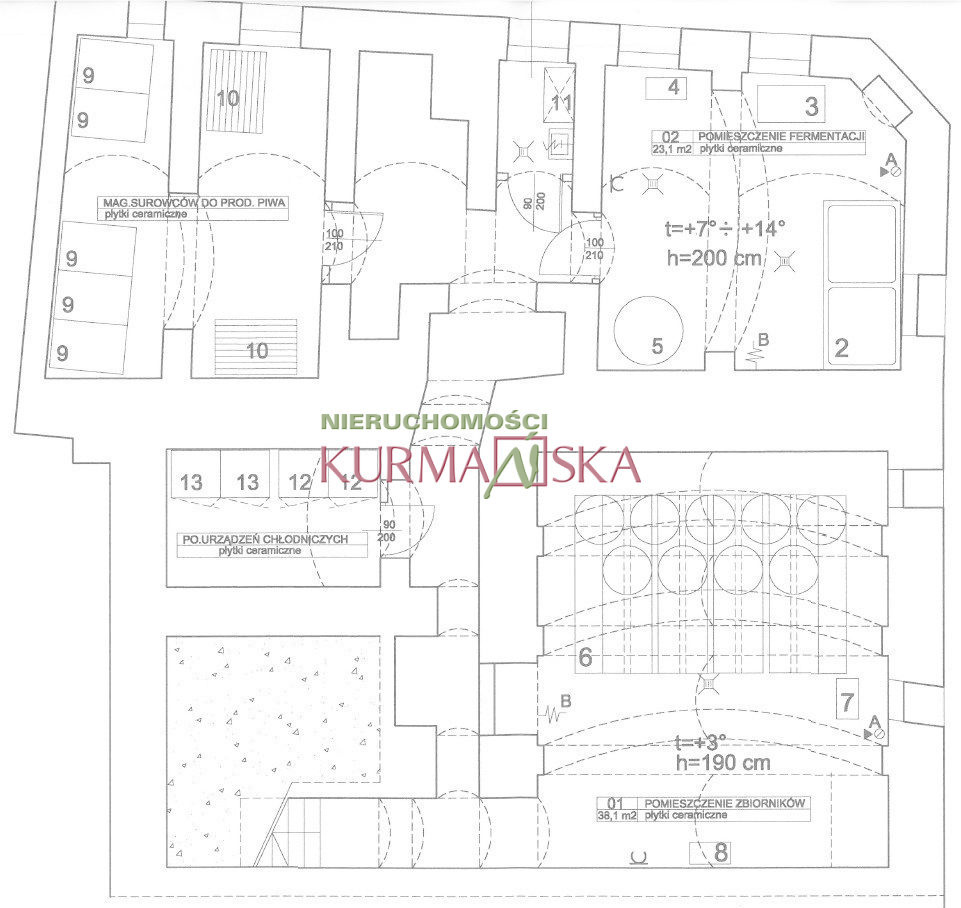- Podpiwniczenie - 109,20 m², z wysokością 1,90 m, wykorzystywane obecnie jako pomieszczenia produkcji piwa, magazyny i pomieszczenia gospodarcze.