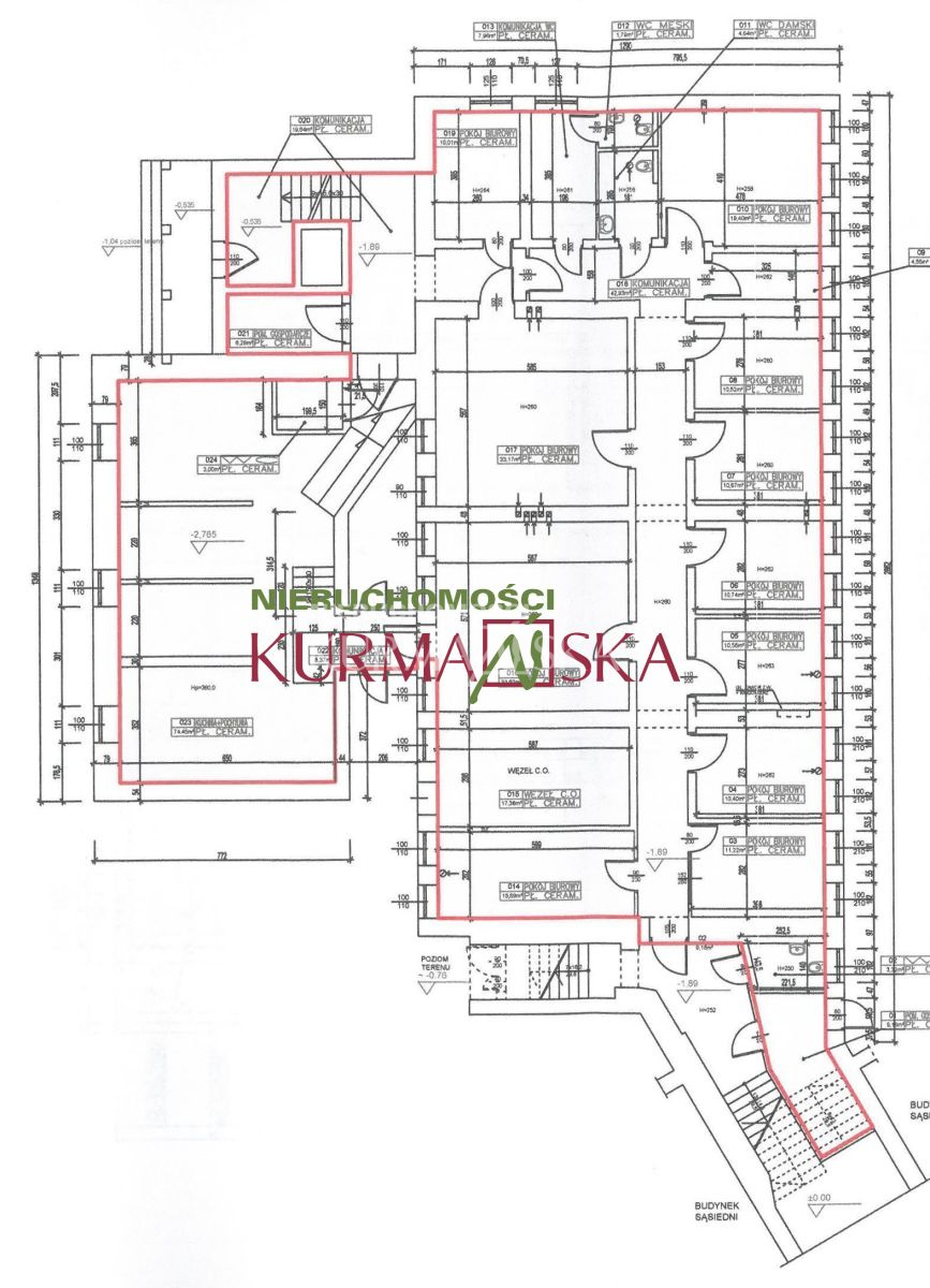 Lokal III - o powierzchni użytkowej 268,96mkw., położony na pierwszym piętrze budynku, składa się z 13 pomieszczeń biurowych, komunikacji, pomieszczenia socjalnego oraz dwóch pomieszczeń sanitarnych (wc).