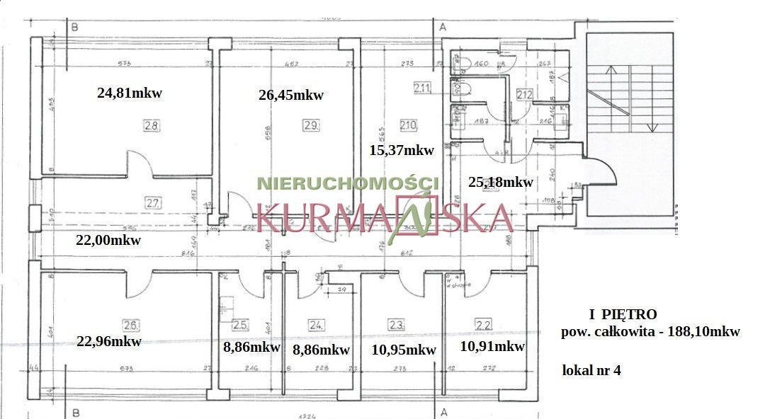 I PIĘTRO - lokal nr 4 o powierzchni 188,10mkw., składa się z 9 pomieszczeń biurowych, komunikacji oraz pomieszczeń sanitarnych.