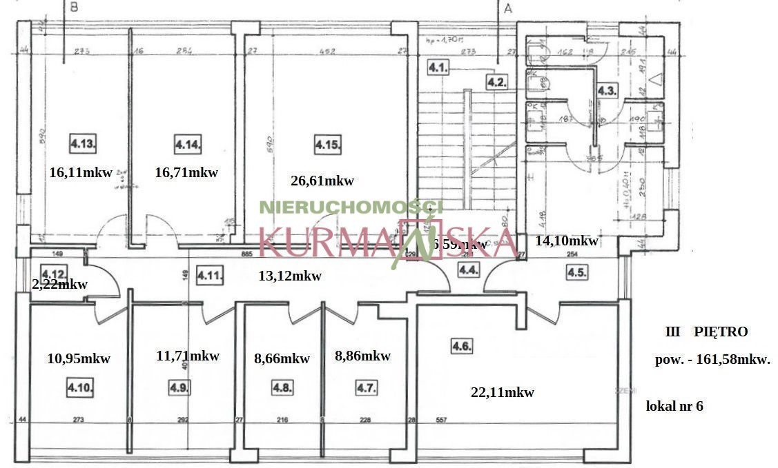 III PIĘTRO - lokal nr 6 o powierzchni 161,58mkw.,składa się 8 pomieszczeń biurowych, pomieszczenia gospodarczego, komunikacji oraz pomieszczeń sanitarnych.